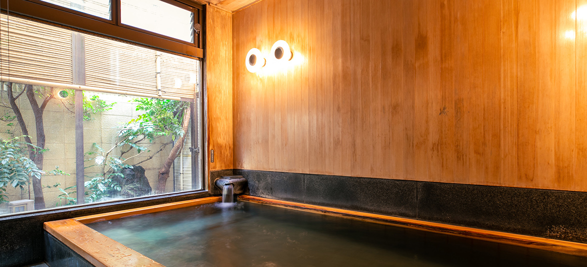 桧の温泉で、ガラス越しに庭園を眺めながらの入浴が楽しめます。